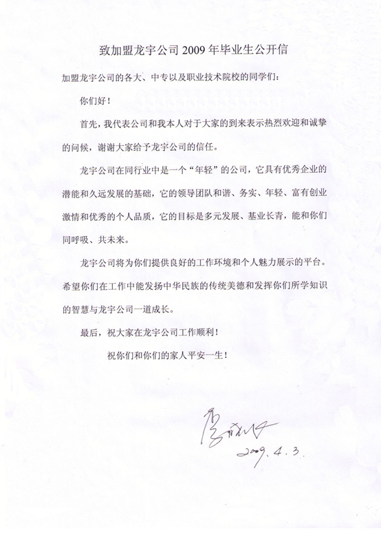 致加盟龙宇公司2009年毕业生公开信