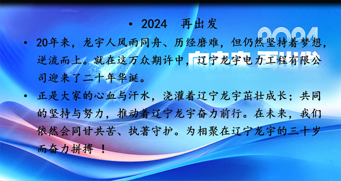 公司发展的二十年,是所有员工伴随着一路走来、一路见证、一路拼搏的二十年;是共渡困苦、执著守护的二十年;是用青春、用心血谱写成歌的二十年;是再回首时值得骄傲、自豪的二十年;是所有龙宇人风雨同舟的二十年。但不只于此,公司会继续砥砺前行,二十年,依然是个起点。我们的目标依旧坚定,向着未来、努力前行、不负韶华、再出发!