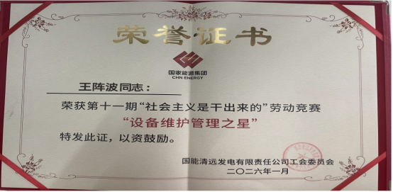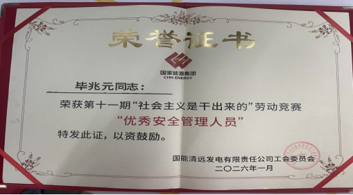 清远电厂以习近平新时代中国特色社会主义思想为指导,为深入践行“社会主义是干出来的”伟大号召,紧紧围绕中心工作,不断发挥先进的示范带头作用,进一步鼓励广大干部职工主动担当作为,全力推进清远电厂各项发展工作,清远电厂决定对第十一期“社会主义是干出来的”劳动竞赛中涌现出的先进个人和先进集体进行表彰,在本次表彰上本单位两名人员获得表彰:其中本单位项目副经理王阵波获得“设备维护管理之星”、项目安全主管毕兆元获得“优秀安全管理人员”荣誉称号。