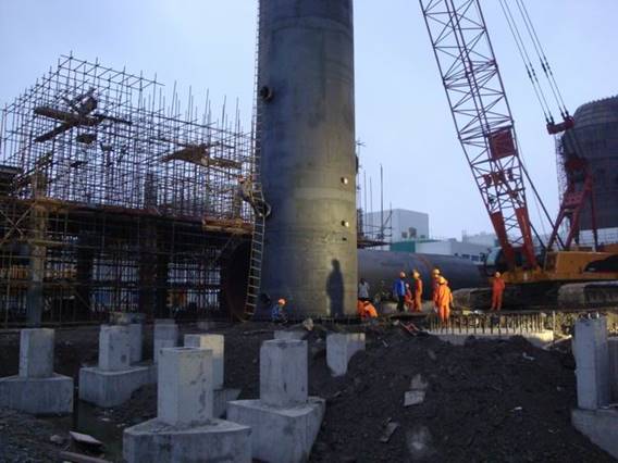 我公司承建的上海石洞口二电厂二期660MW脱碳工程已于今日正式施工,工期紧、任务急,经过精心准备,职工们昼夜施工,仅用二十二个小时的紧张施工于今日早晨七点将单节高度40.5米吸收塔和再生塔下段顺利安装就位。