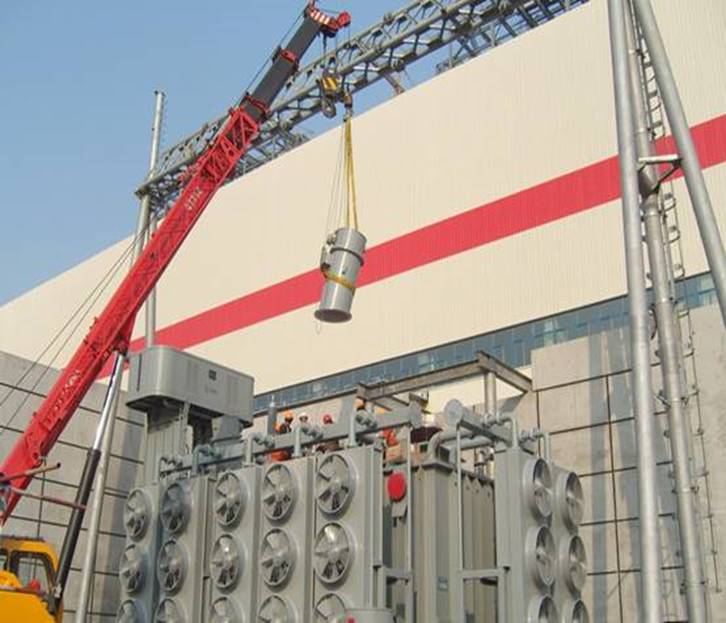 我公司电气专业公司秉着“磨刀不误砍柴工”的宗旨,将各项准备工作一一做到位。施工人员兵分三组,一组在地面开箱及拆卸保护盖板,一组组装变压器器身,一组配合电试班做试验,做到了各项工作准备充分、技术措施得当、安全措施到位。因此,整个安装过程十分顺利。线圈检查、铁芯检查、铁心接地检查、引线检查,螺栓紧固,主变套管吊装等工序一气呵成。随着紧张有序的工作, 主变附件安装完成。看着威风凛凛地伫立在阳光下的12个钢铁巨人,施工人员露出了欣慰的笑容!