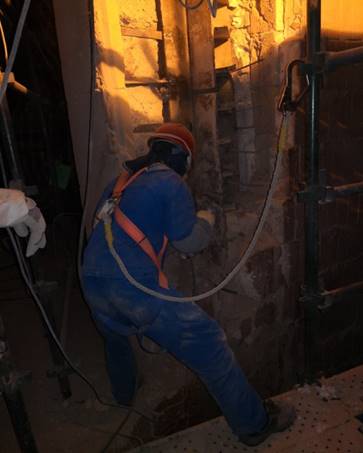 一号炉抢修结束后,我们的人员直接从一号炉转到了二号炉。二号炉虽然是由于再热器管屏和省煤器管屏同时发生泄漏造成了停炉,但#2炉的主线工作却是在炉膛出口水平烟道内浇注料损坏的修复,此部位的耐火浇注料发生了大面积的塌落,很大面积的钢板由于烧损也需要更换。浇注料的修复一直是由江苏宜刚耐火材料公司的专业人员进行维修的,也归口检修部管理,由于这次的修复工作量非常大,宜刚公司在现场的专业维护人员只有1个人,同时,中国电力工程有限公司博茨瓦纳项目部受到中国驻博茨瓦纳大使馆和博茨瓦纳矿水部的托付以及业主的要求,承诺在11月30日前完成2号炉的全部检修工作。这样的工期在监理的眼里看来几乎是不可能的。为了实现承诺,中国电工项目部马上跟国内宜刚公司联系,安排国内马上调配支援人员,尽快办理签证手续,手续完成后第一时间安排入场。现场这边我们公司也马上组织人力,全力支援浇注料修复工作。我们根据施工作业面的技术需要,安排了多方面的人力,或独立操作,或专业人员带领,很快的将作业面开展起来。我们的员工不怕脏,不怕累,中午加班,晚上也加班,能独立作业的就独立作业,不能独立作业的就在宜刚的专业人员指导下边学边做,葛培宝、赵红军两个人,从开始就一直跟随宜刚的专业人员做着跨专业的作业,泥瓦工、木工、力工,脏、苦、累,但却没有抱怨,一直坚持着,直到最后全部完工。11月14日,宜刚国内的2名专业施工人员到场后,浇注料修复工作方面的人力压力得到了缓解,但施工任务依然艰巨,而且除了浇注料的修复工作以外,还有大量的机务专业的工作没有完成,同志们仍然需要继续加班加点,不但要保证浇注料修复的按时完成,同时也要必须保证水压节点的完成,这样才能真正实现我们的承诺。经过大家的共同努力,11月29日晚上,我们完成了全部计划中的施工任务,11月30日经过监理检查后,我们关闭了全部工作票,为我们的承诺画上了一个完美的句号。