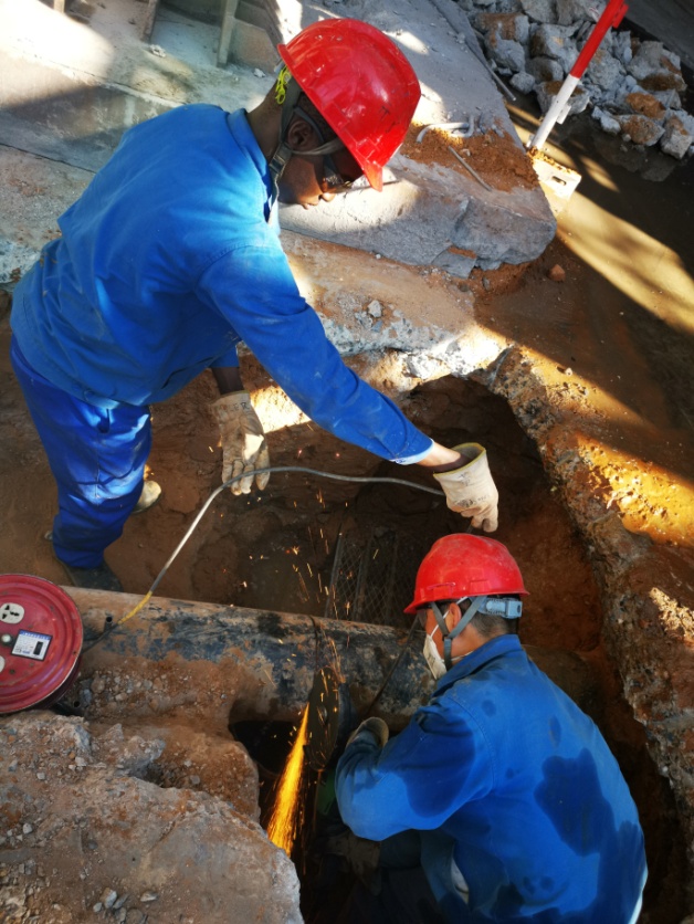 原来的第一方案使用堵板直接焊在官道上进行封堵,但以现在的情况看,水流是不会停止的,直接焊接已经不可能了,施工组长崔建卫是一位非常有经验的老师傅,提出改用法兰连接方式进行封堵,这是一个非常好的办法。于是,我们的安全主管兼施工负责人曹德宏马上联系物资部门,开车到仓库领出了一对法兰和螺栓、橡胶垫等材料,迅速送到现场。崔建卫先将一片法兰套在管道上,然后在管道和法兰之间的缝隙用密封料进行了封堵,然后在法兰的背面进行焊接。
