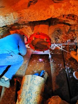 因为水在不停地流,密封料不时地被水冲刷掉,只能不停地重复塞,塞一段焊一段,带水的焊接是非常困难的,水流小的地方还可以将就着焊,水流大的地方根本就焊不上,只能一点一点地点焊,让缺口一点一点地缩小,等到最后收口的时候,用密封料用力地塞紧,快速地进行封口,然后再把整个焊口重新完整地焊一遍。说的时间很短,实际上,我们用了将近四个小时才把这道焊口焊接完成。焊完法兰,我们又制作了一块圆形盲板和一个橡胶密封垫,把另一块法兰和这块盲板加上橡胶密封垫用螺栓与焊好的法兰连接起来,紧固好螺栓后,管道内的流 水终于被堵住了,而且滴水不漏。