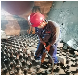 炉膛风帽的更换安装工作在做好密闭空间安全防范措施的前提下,注意成品保护意识,防止在拆除浇注料和切割时损坏原有管道。这项工作任务量大、时间紧,但我们依然以高标准严格控制工程质量,现工程进度按计划稳步持续推进着。