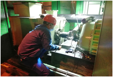 场内空压机房NO.12空压机振动过大的缺陷长时间以来一直是困扰着甲方维护人员的难题。我们勇挑重担承接了这项艰巨的任务。在机器振耳的轰鸣声中和闷热潮湿的空间里,我方工作人员汗流浃背如洗了桑拿浴一般,但他们依旧一丝不苟的测量、分析数据并制定合理化解决方案。为了彻底解决顽疾每一步的精心操作都显得十分重要,他们以严谨的工作作风态度克服施工空间狭小,不顾满身油污地认真处理好每道工序,就连以工作严谨著称的白人监理看了都不禁伸出大拇指啧啧称赞!