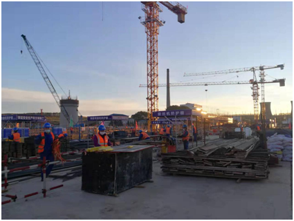 晨曦中的行政综合楼施工现场 早班会结束后,施工人员进入工作岗位