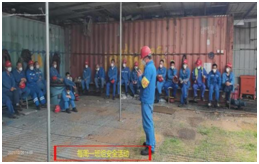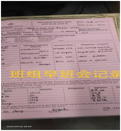 现场施工班组配备有专职安全员,执行每天施工前的站班会、每周一下午半个小时的安全专题会(safetytalking)。