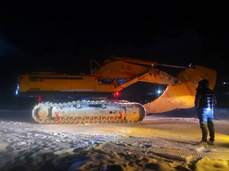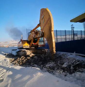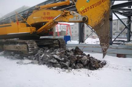 正月十一,我们开始了艰难的施工。这天的最低气温是零下37℃,就在这寒冷的寂静中,轰鸣声伴随的少量的浓烟,我们的特殊专业设备鹰嘴钩开始工作。令人惊喜的是,对于这种地面冻层,这台鹰嘴钩真不愧是专业设备,破碎冻土层的速度超过普通破碎机械的3倍以上,不到1小时就破碎出4米宽10多米长的一段路面。但由于冻土深度接近3米,鹰嘴钩每次破碎所达到的深度最多只能达到1米左右,我们只能分层破碎:先破碎第一层,然后用挖机将第一层破碎后的冻土挖走,鹰嘴钩再回过头来进行第二层破碎,只有这样才能把冻层完全破碎,但在这么残酷的环境下这种工作效率已经相当喜人了。