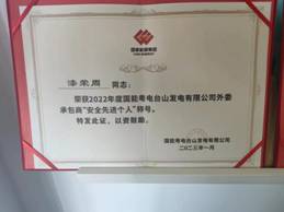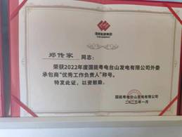 其中项目员工郑传家荣获2022年国能粤电台山发电有限公司外委承包商“优秀工作负责人”称号;漆荣周荣获2022年国能粤电台山发电有限公司外委承包商“安全先进个人”称号。